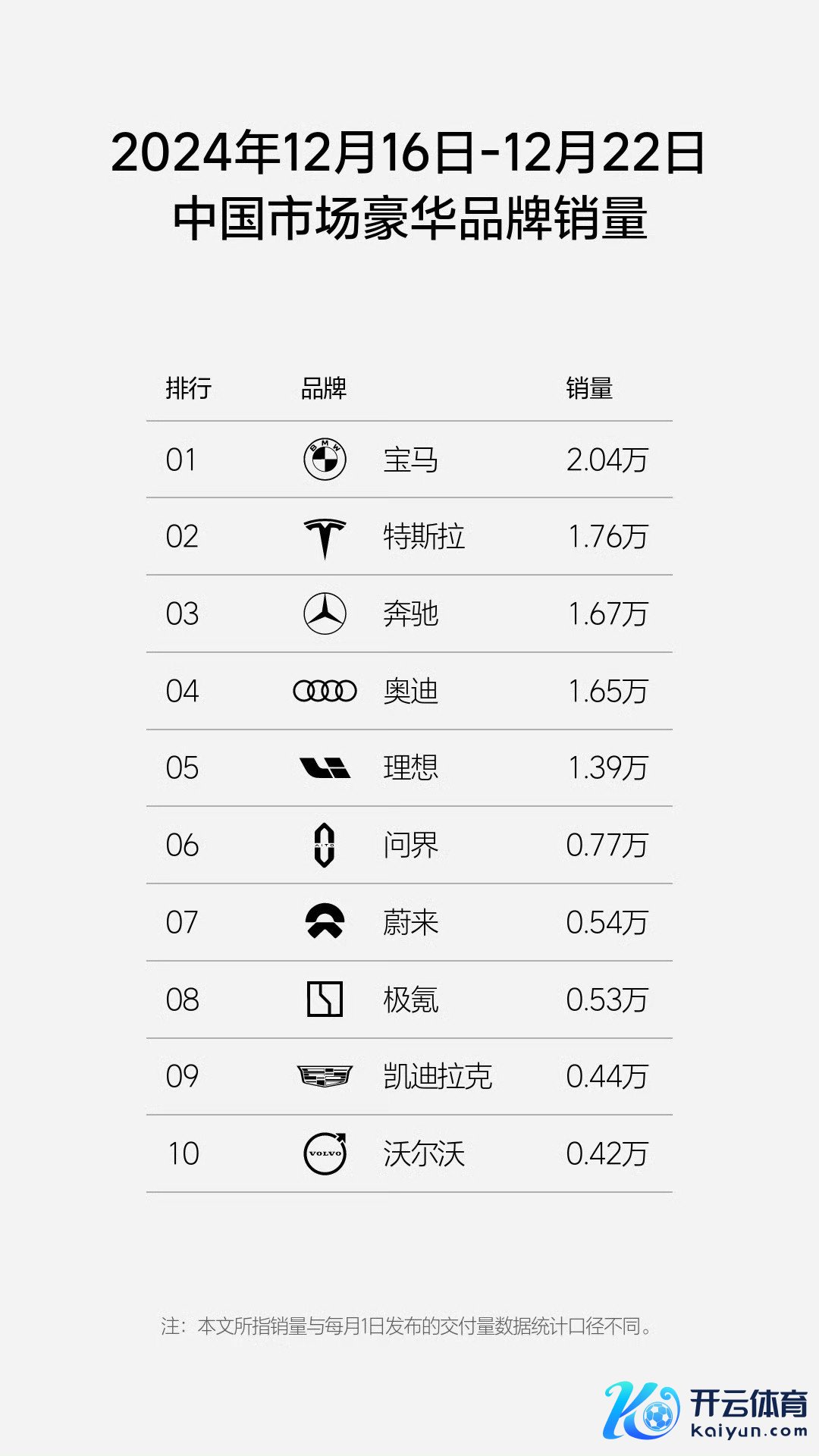 凭据最新的周销量数据暴露,在2024年12月第三周,良马以2.04万辆的收成排在了中国阛阓豪华品牌的第别称;第二名是新能源汽车中炙手可热的特斯拉,周销量达到了1.76万辆;第三名和第四名则是疾驰与奥迪,区别卖出了1.67万辆和1.65万辆新车。