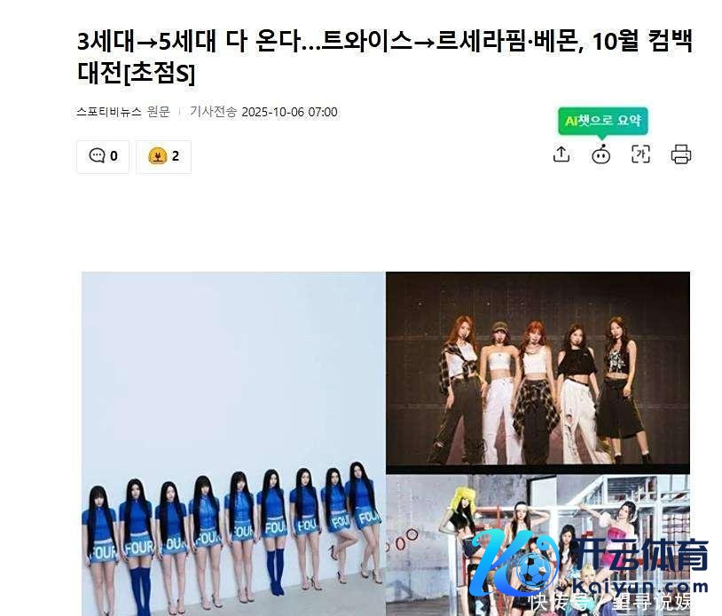 据韩国媒体10月6日报谈,中秋连休刚落下帷幕,韩国歌谣界便火速演出了一场“历代级”女团总结混战。从三代霸主到五代新锐开云体育,各世代代表女团皆皆对准十月,号称“伟人打架”的名所在行将演出。