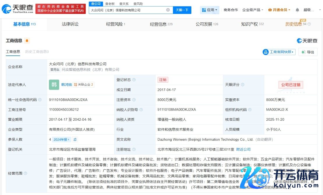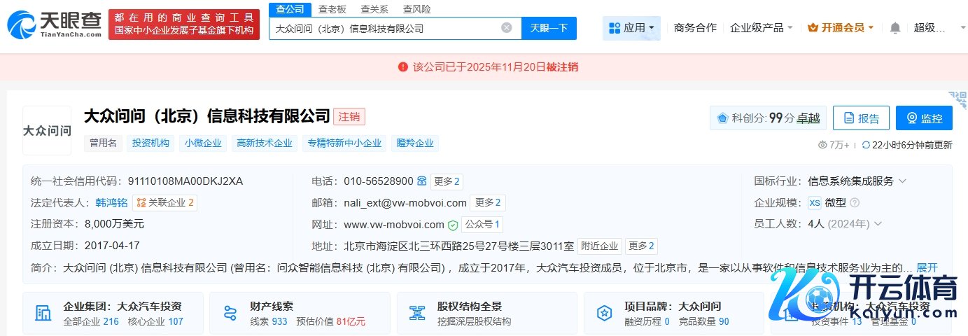 每经AI快讯,天眼查App显现开yun体育网,近日,各人问问(北京)信息科技有限公司登记情状由存续变更为刊出。此前,该公司已发布刊出备案公告。该公司斥地于2017年4月,法定代表东说念主为韩鸿铭开yun体育网,注册本钱8000万好意思元,计较边界包括东说念主工智能基础软件开发、汽车零部件及配件制造、数据惩办和存储救济作事、电子元器件制造等。鼓吹信息显现,该公司由各人汽车(中国)投资有限公司全资合手股。