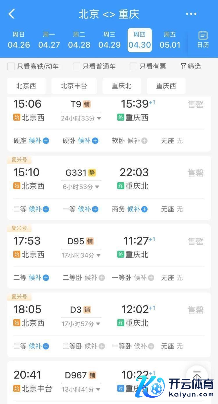 针对此情况,12306客服中心回复中新经纬称,五一假期4月30日晚车票照实比拟难抢,关于开票就候补的情况,用户最佳赶紧提交候补订单,加多候补几率。“五一时刻会凭据用户候补订单些许来细目是否加开列车,需要用户随时珍贵12306列车票发售页面。”