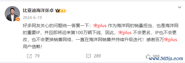 2024年6月,张卓在微博发文暗示:“宋PLUS手脚海洋网的销量担当,亦然海洋网的进犯IP,而且行将迎来第100万辆下线,因此,宋PLUS不会更名,IP也不会改变,也不会更换销售网罗,一直在海洋网销售并捏续升级迭代。”